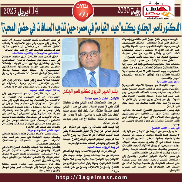 الدكتور ناصر الجندي يكتب:”عيد القيامة في مصر: حين تذوب المسافات في حضن المحبة”